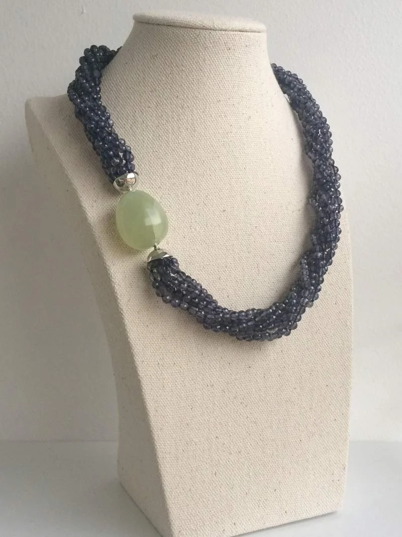 Pictured here with a faceted iolite multistrand necklace the green contrasts beautifully with the muted blues. It will also combine well with creams and different shades of green.