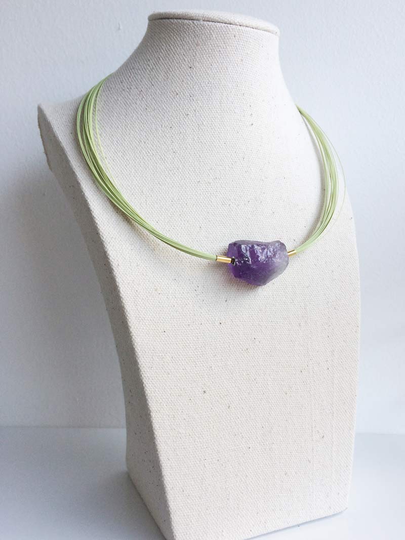 Green wire multistrand necklace with pale amethyst nugget clasp